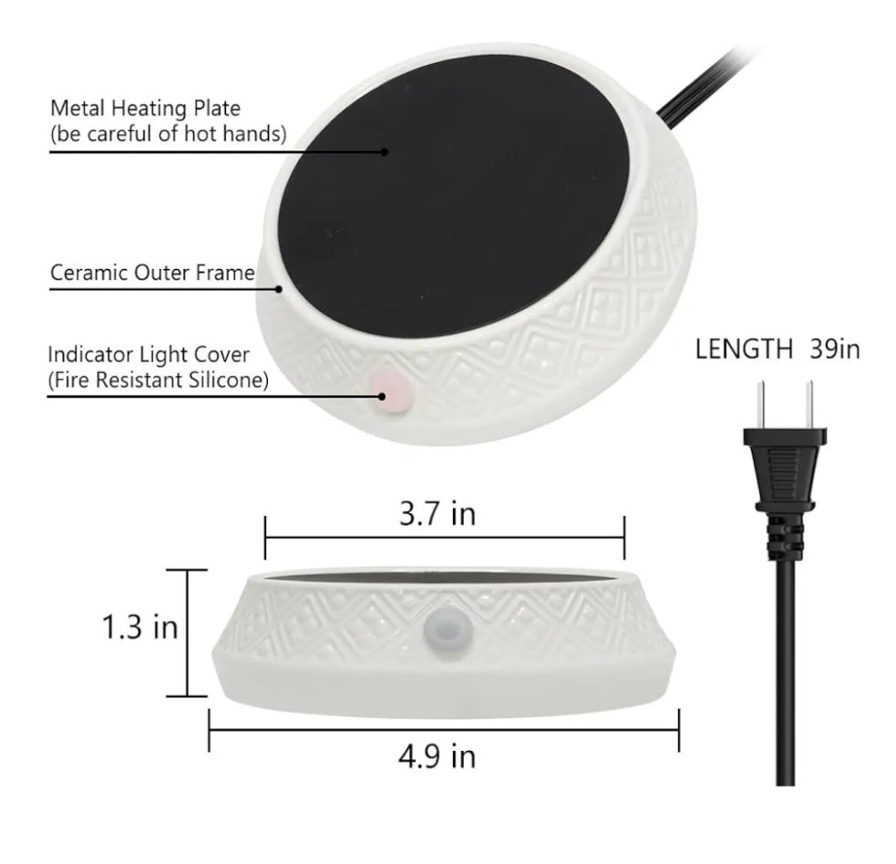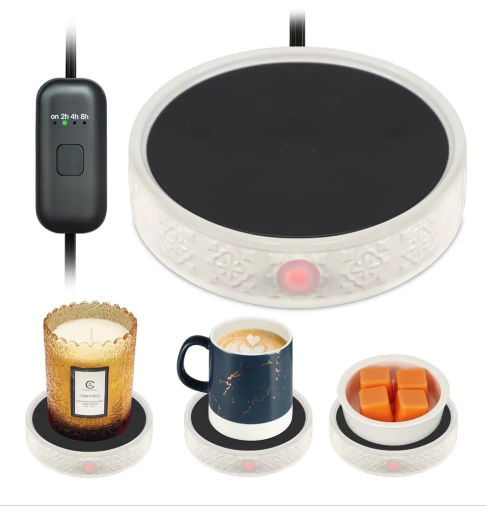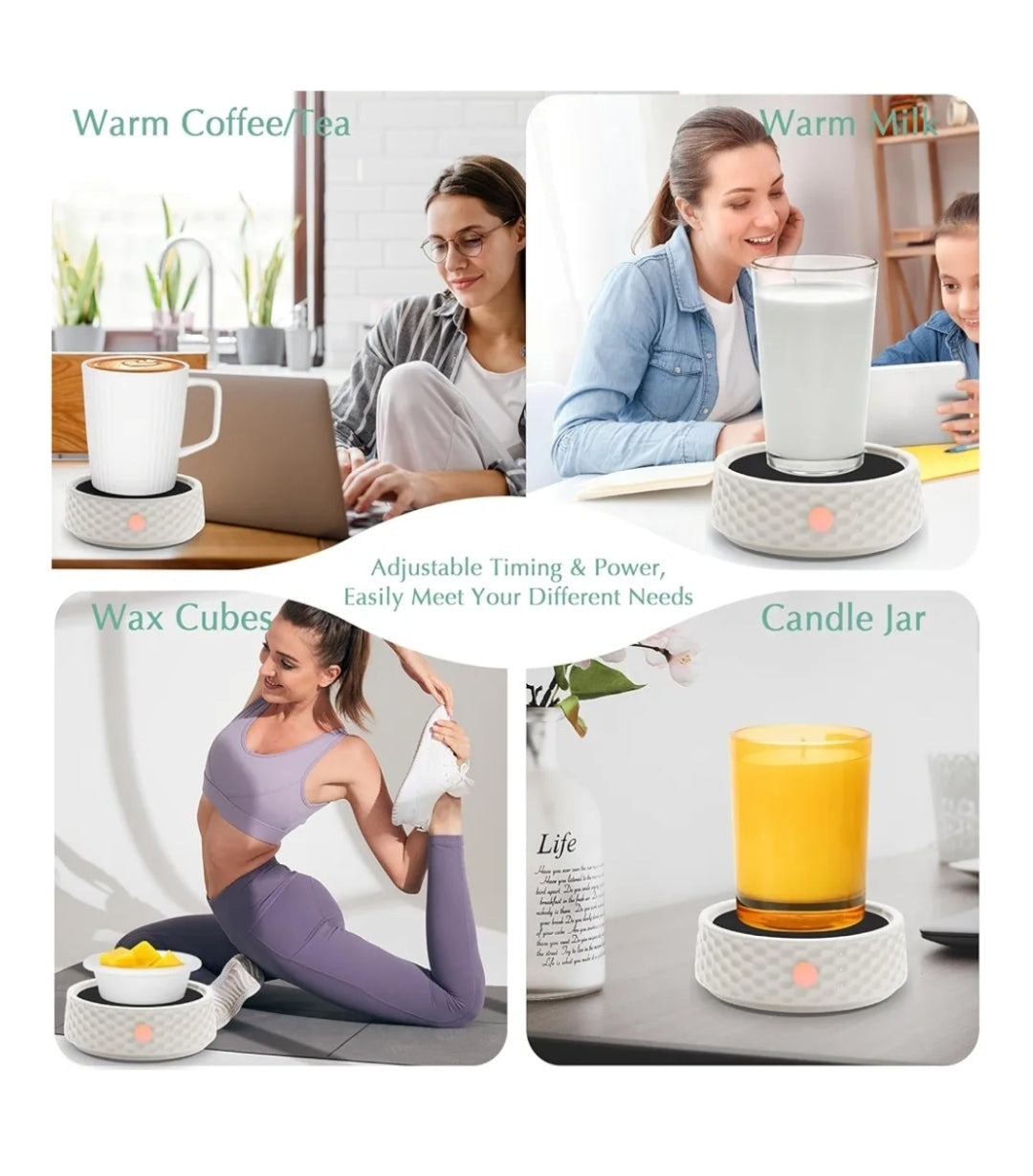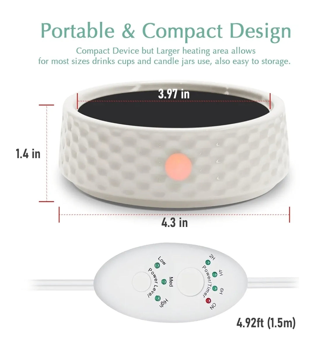 - 【Multi-Functional Warmer】:electric for office, dorm rooms, etc., can fit most flat-bottomed cups, such as ceramic cup, glass cup, stainless steel cup etc. It can also be used as a Candle Jar or Wax Melts warmer plate to warm up your scent candles to fill your room with fragrance.